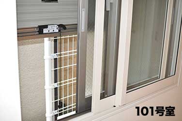 101号室は窓下設置のエアコン室外機の防音と防犯のため二重サッシとシャッターを設置してあります。