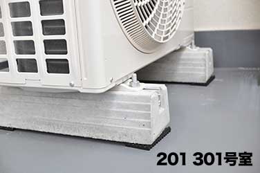 201・301号室のエアコン室外機はベランダ設置ですが、基台はコンクリート製とし防振ゴムを敷いてあります。
