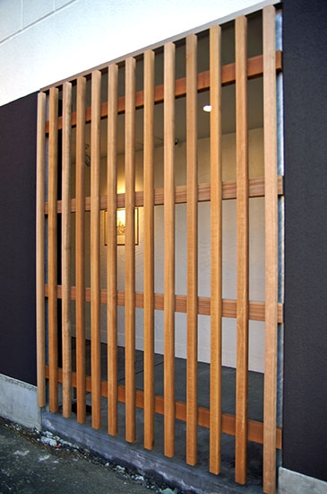 「れ谷中」の素敵な空間をすこし感じてみてください。 れ谷中の外観です。建物の側面です。木材の格子がエントランス内に優しい光を導きます。