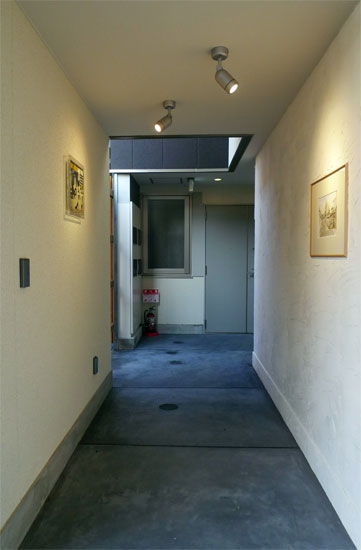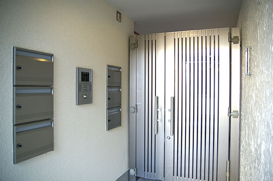オートロックのエントランスオリジナルデザインの表札お落ち着いたエントランス内部